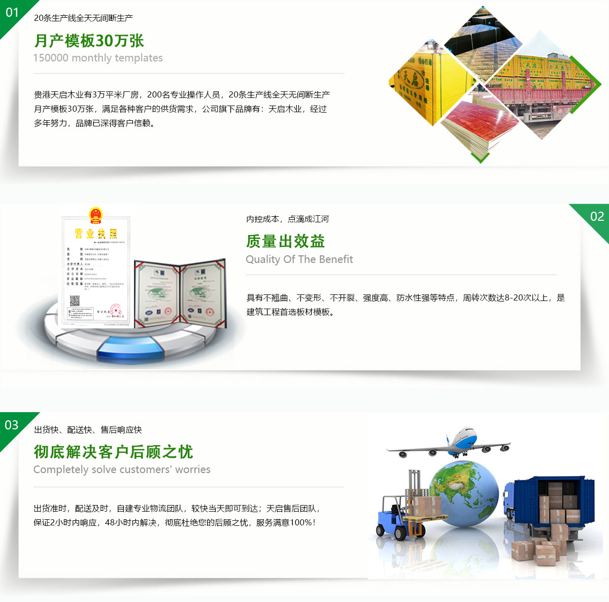 獨(dú)有對模板快速拆裝、重復(fù)使用、脫模效果好等優(yōu)勢;天啟木業(yè)模板高端質(zhì)造的外表之下藏著一顆強(qiáng)大的實(shí)用匠心!